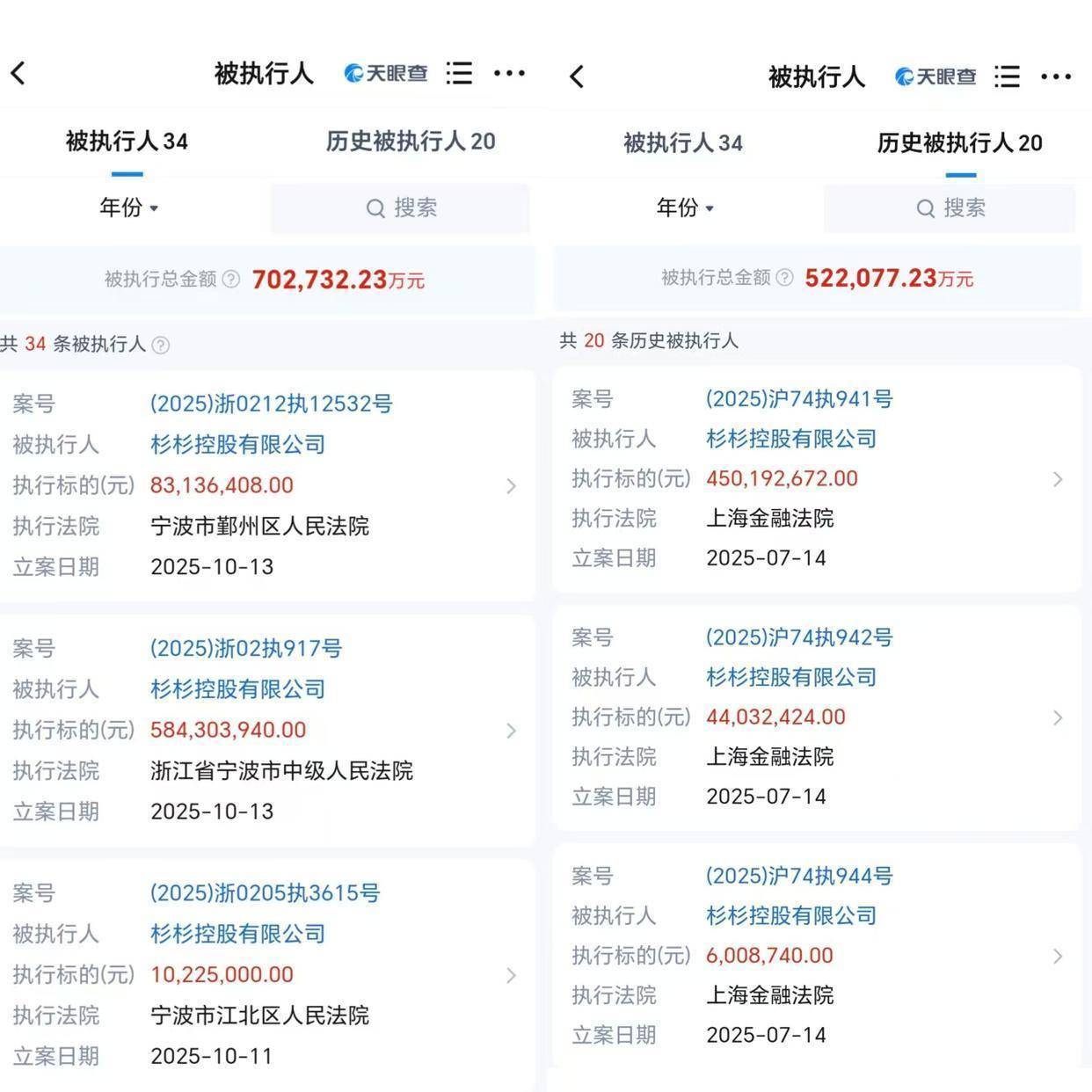 截至目前,杉杉控股被执行人信息有34条,被执行总金额超过70亿元;历史被执行人信息20条,被执行金额超过52亿元,合计金额超过122亿元。